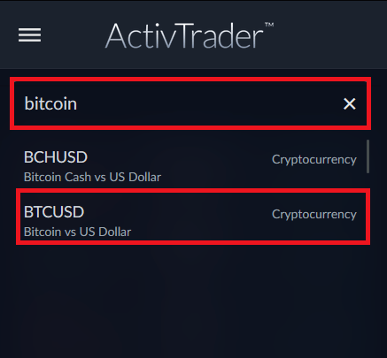Este paso es realmente sencillo en la plataforma de ActivTrades, en la parte superior izquierda encontrarás el buscador de activos, escribe el nombre de tu activo, en nuestro caso utilizaremos el ejemplo de Bitcoin (BTC).
