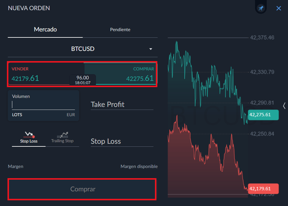 Para realizar tu compra, en el margen derecho encontrarás la opción de compra o venta, haz clic en “comprar” para tener acceso al menú de compra. En este menú deberás seleccionar la cantidad del activo que deseas comprar.