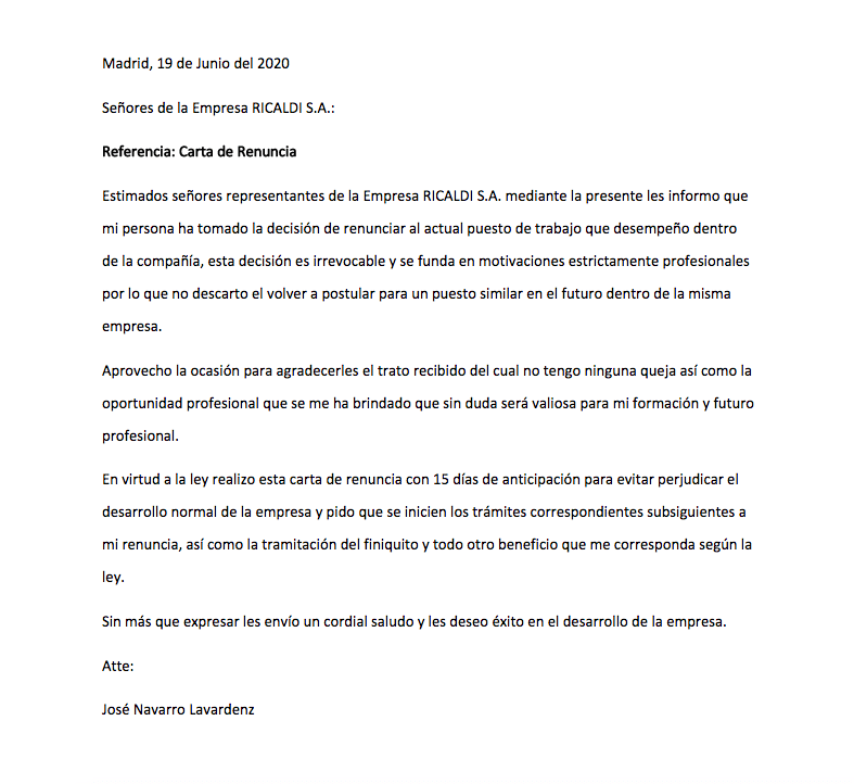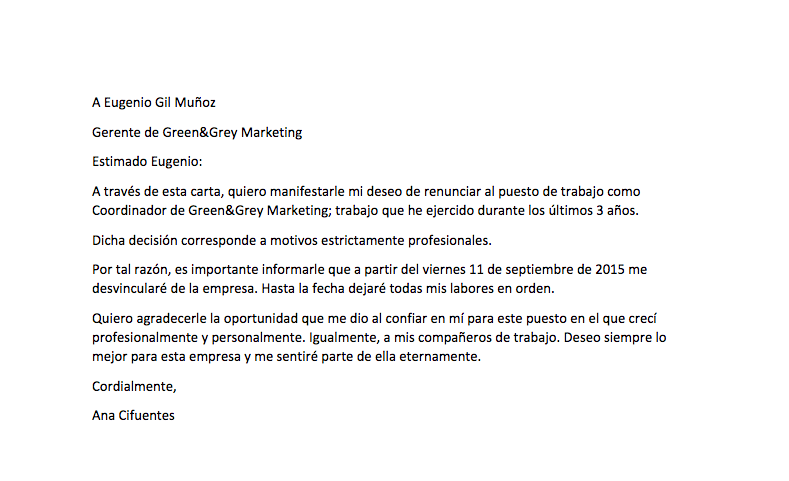 Si preferimos no poner fecha e ir directamente al mensaje, este ejemplo de carta de renuncia es el ideal: