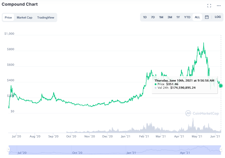 Las cosas cambiaron en 2021 para esta criptomoneda, como sucedió con muchos de sus pares. El 6 de febrero alcanzó un máximo de 535,29 dólares y experimentó altibajos hasta finales de abril. Se situó en 475,97 dólares el 20 de abril y luego repuntó, alcanzando un máximo histórico de 854,45 dólares el 12 de mayo, un aumento de casi 80% en el lapso de poco más de 20 días. Pero el precio COMP se vio afectado por la caída generalizada del mercado crypto de fines de mayo, cayendo a $ 344,54 el 24 de mayo, una pérdida de poco menos del 60% con respecto a los 12 días anteriores.