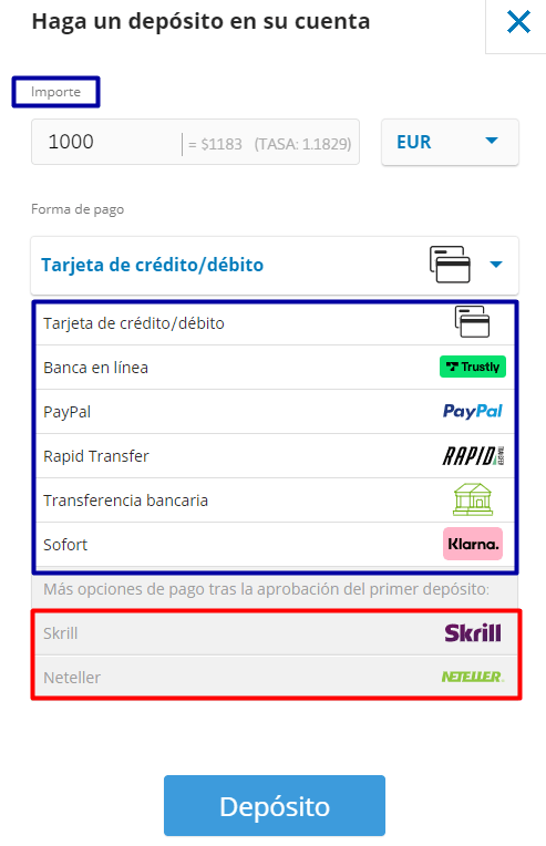 En eToro el depósito mínimo inicial son 200 dólares americanos, o 170 euros. Puedes pagar con tarjeta de crédito, débito, transferencia segura, PayPal y otros métodos. Recomendamos empezar con el importe mínimo para principiantes.