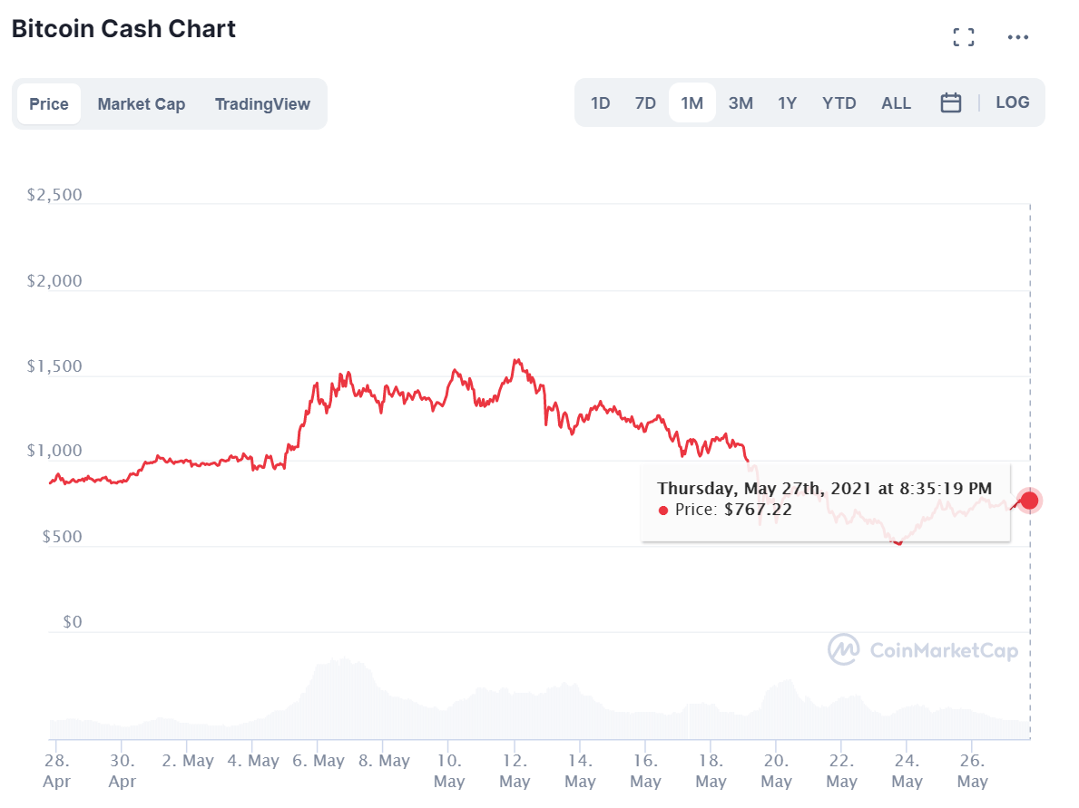 Al momento de redacción de esta guía, éste es el precio de Bitcoin Cash: 1 unidad de Bitcoin Cash cotiza a unos $769 dólares norteamericanos, un 4.25% más que ayer, con un margen de maniobra entre los $702 y los $806, como vemos en el gráfico a continuación: