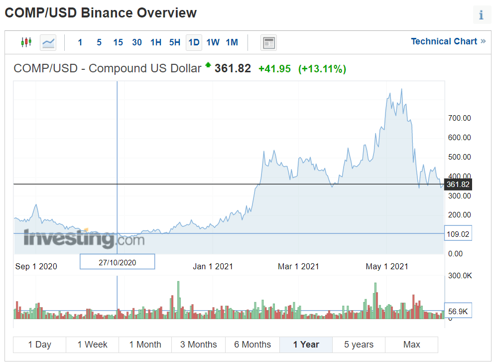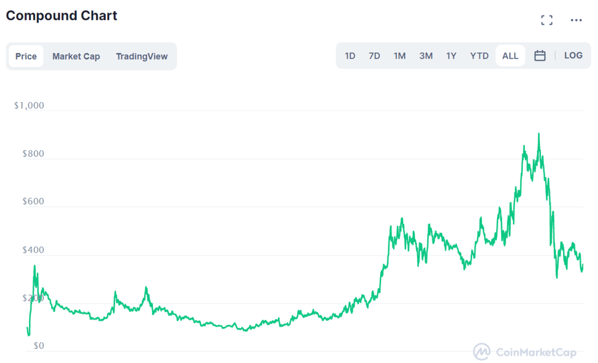 El precio de Compound Governance Token se sitúa a la escritura de esta guía en los $354 USD, un 11% más que el día anterior. Estamos actualmente en el triple del valor con el que COMP inició el año 2021 (en $123 USD).
