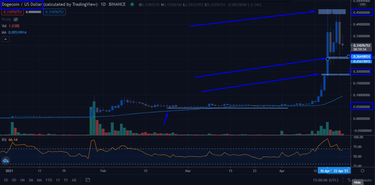 Si todavía no has visto una gráfica que muestre la evolución de Dogecoin desde el 1 de enero de 2021, en esta sección te vamos a mostrar uno. Además te mostraremos los niveles de entrada en distintos soportes creados en el precio de Dogecoin.
