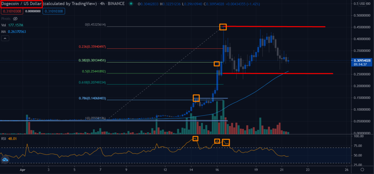 Vemos como el precio, una vez tocado el máximo, corrige hasta la zona 0,5 de Fibonacci, siendo las corrección más repetida en la mayoría de tendencias. Por otro lado, si volviera apoyar de nuevo en esa zona, se formaría un soporte MUY INTERESANTE, el cual podrías utilizar para comprar Dogecoin (entrada en los 0,26$). Si esto ocurre, un escenario bastante probable sería ver en pocas semanas al precio en los 0,45$ de nuevo.