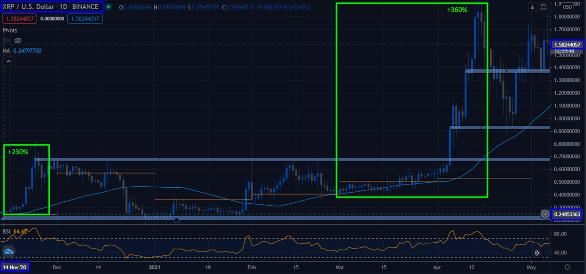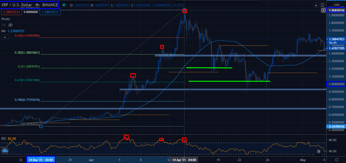 Si echas un vistazo al gráfico de nuevo, puedes apreciar cómo el precio de Ripple actúa en esas zonas. Una vez el precio vuelve a su tendencia alcista (en este caso), dibujamos una zona de entrada en la resistencia de los 1,30$. Así es como lo hicimos en este caso y esperamos continuar con la tendencia alcista hasta los 4$.