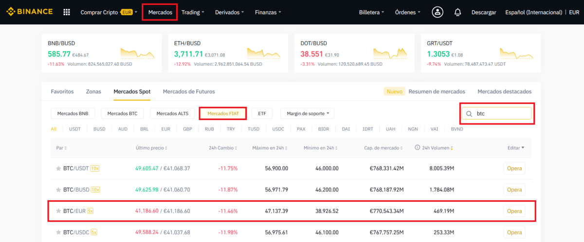 Este paso es bastante sencillo, tan solo debemos acceder a la sección “Mercados” en la parte superior de la plataforma, una vez allí, si lo que deseamos es comprar criptomonedas directamente con euros debemos clicar sobre “Mercados Fiat” y a continación buscaremos la criptomoneda deseada, en nuestro caso usamos el ejemplo de “BTC/EUR”. Para ello solo debemos clicar sobre “Opera” en la parte derecha.