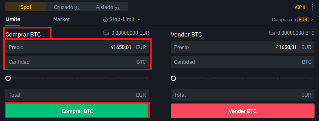 En esta pantalla tendremos la opción de indicar a Binance el mercado en el que queremos operar. Recomendamos utilizar “spot” si no deseas operar con otros productos financieros. Para ejercer nuestra compra, Binance nos permite seleccionar el precio de compra o la cantidad deseada de cualquier criptomoneda, así como colocar un stop-limit.