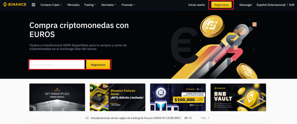 Lo primero que debemos hacer es acceder al sitio web de Binance, una vez allí rellenaremos con nuestro correo electrónico la sección que observamos en la siguiente imagen: