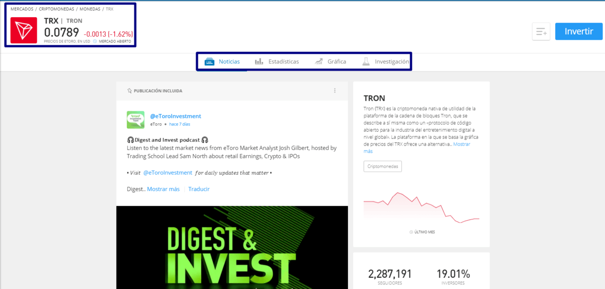 También puedes utilizar el buscador situado en la parte superior de la pantalla para encontrar Tron fácilmente. Seguidamente, clicamos en «TRX» y accedemos a las funciones de social trading y estadísticas de eToro acerca del criptoactivo: