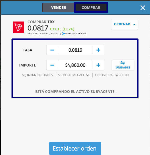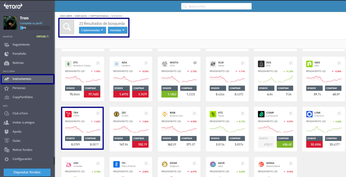 A continuación, vamos a ver cómo comprar Tron con un bróker online. Como verás, el proceso es bastante sencillo, por lo que si estás pensando en comprar Bitcoin, comprar Cardano o cualquier otra cripto que esté disponible en la plataforma, podrás seguir los mismos pasos.