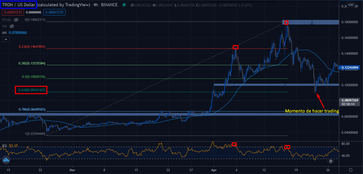 Si quieres encontrar un buen momento para comprar Tron, lo importante es ver cómo se va a apoyando el precio en los distintos niveles de Fibonacci. Como puedes ver en la imagen superior, el nivel 0,618 nos abría una gran oportunidad de trading en el corto plazo.