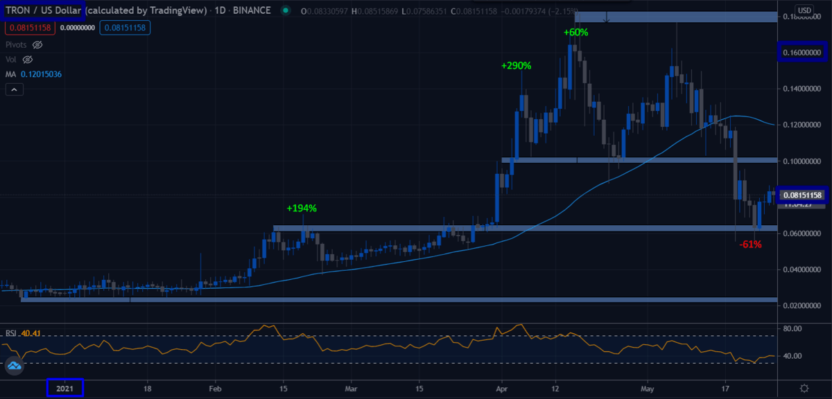 El precio de Tron ha llegado a crecer en 2021 hasta un 700%. En el gráfico inferior, te vamos a mostrar cuánto ha crecido TRX en cada uno de los impulsos y cómo ha afectado la corrección sufrida en mayo de 2021.