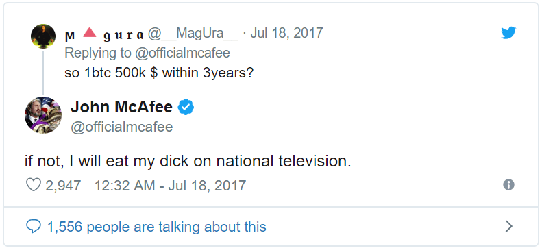 El controvertido emprendedor parecía estar realmente seguro de que su pronóstico se cumpliría con Bitcoin, John McAfee en esta ocasión fue más que nunca John McAfee, Twitter fue testigo de ello: «If not, I will eat my dick on national television».