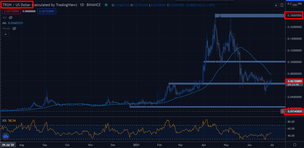 Con una inversión de 500€ realizada en diciembre de 2020, podrías tener actualmente cerca de 2.300€. Todo esto teniendo en cuenta que no hubieras vendido tu posición en el pico de los 0,18 TRON/USD.