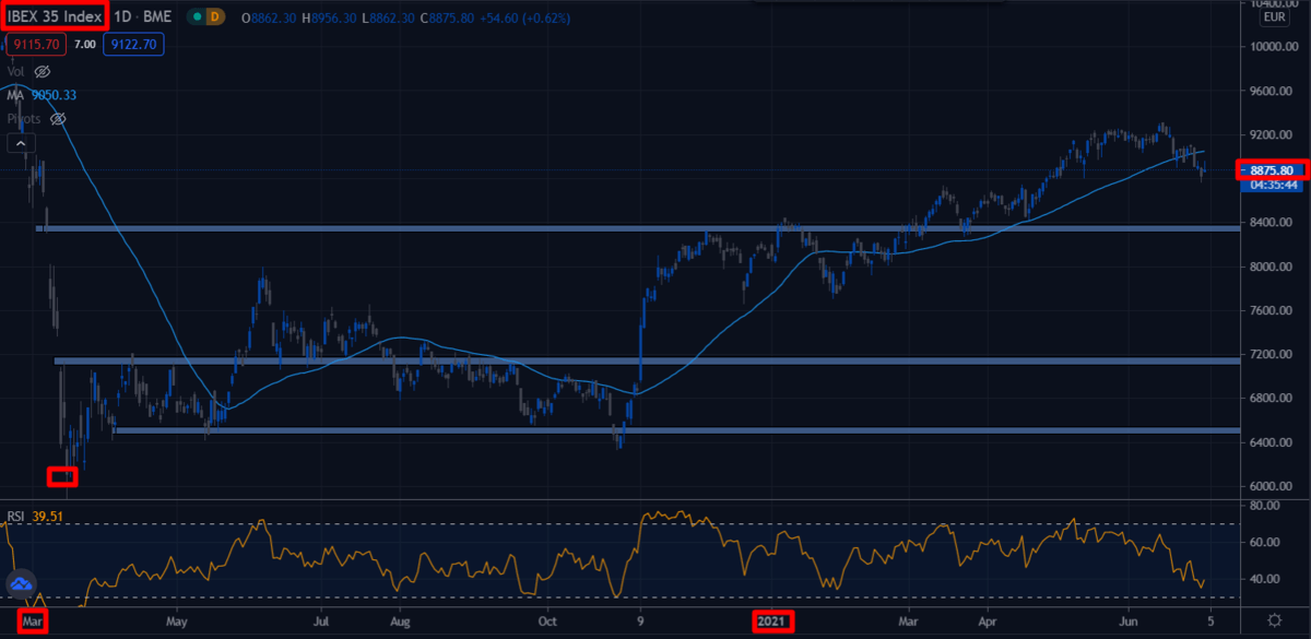 - La bolsa española está en crecimiento después de la caída subida a principios de 2020 como refleja el IBEX 35.