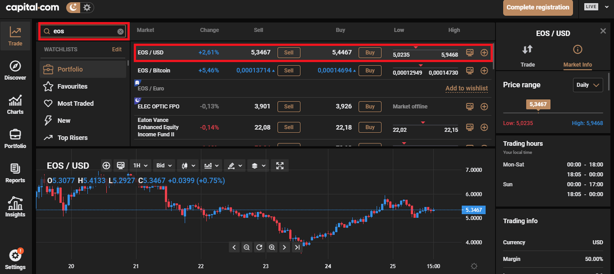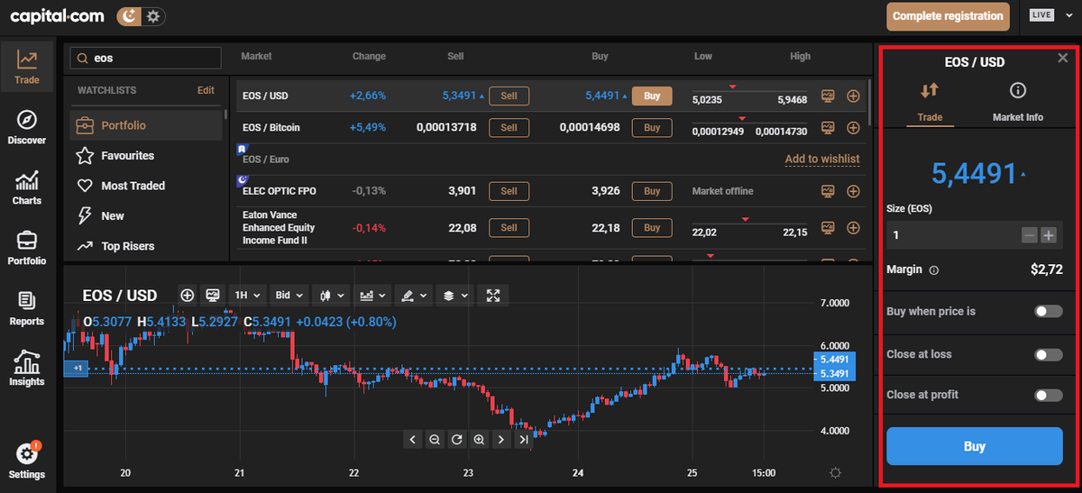 Una vez acreditados los fondos, vamos a comenzar a operar y hacer trading con los diferentes mercados que ofrece Capital.com. Para encontrar cualquier activo en Capital.com hay que dirigirse a “Trade”, ubicado a la izquierda de nuestra pantalla y escribir el nombre del activo. Utilicemos ahora EOS como ejemplo.