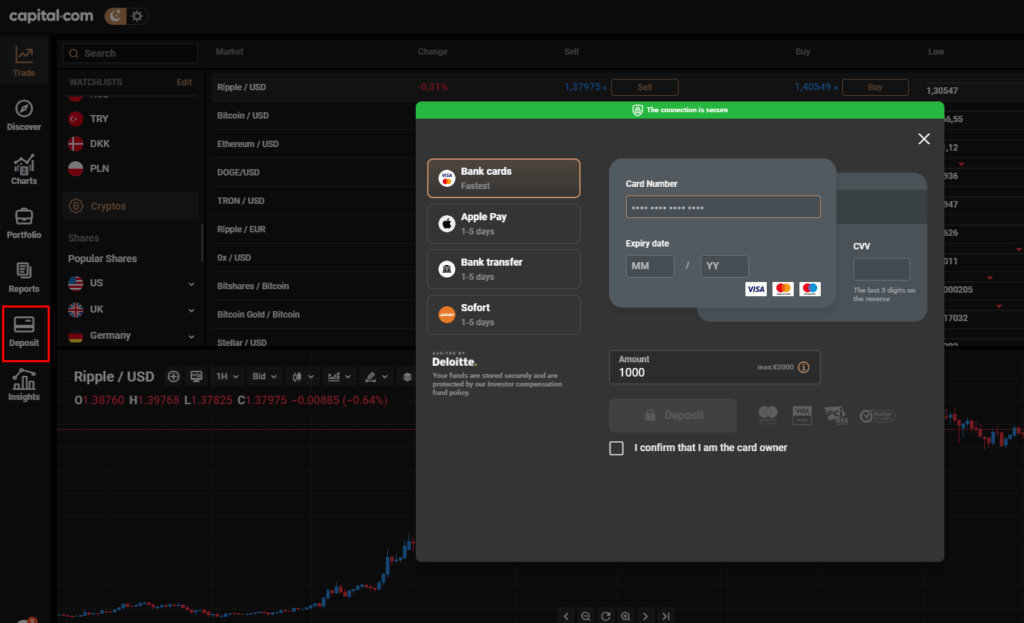 En Capital.com se pueden utilizar 13 métodos de pago para invertir en cualquier activo. Skrill, Sofort, Trustly y Neteller son algunos de ellos. Además, también se puede enviar dinero mediante transacción con tarjetas de crédito y débito.
