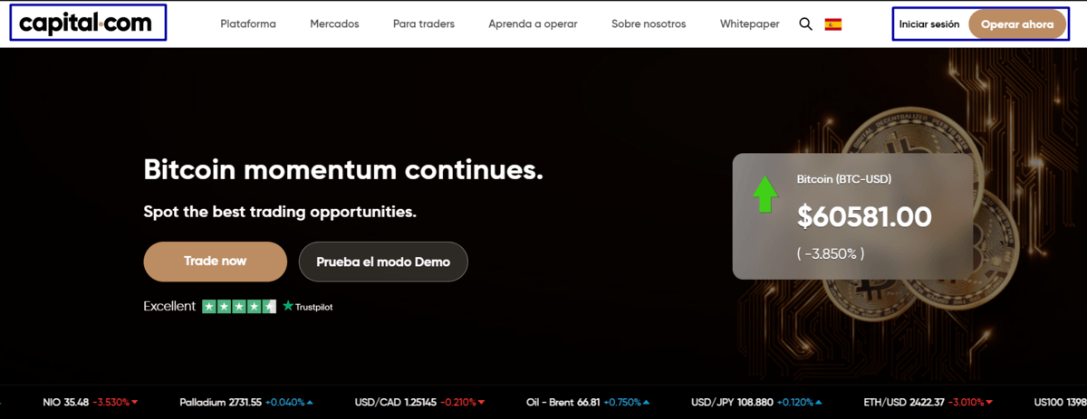 Para abrir una cuenta en Capital.com, vamos a ir a su página principal, antes que nada. Una vez allí, nos vamos a topar con dos opciones para dar inicio al proceso, “Trade Now” y “operar ahora”. Haciendo click en alguno de esos dos botones, podremos comenzar la apertura de cuenta: