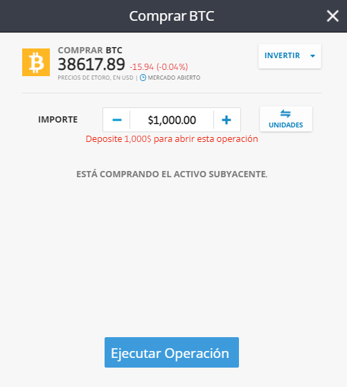 Siguiendo con el ejemplo de Bitcoin, el último paso es dar click en “Invertir”: