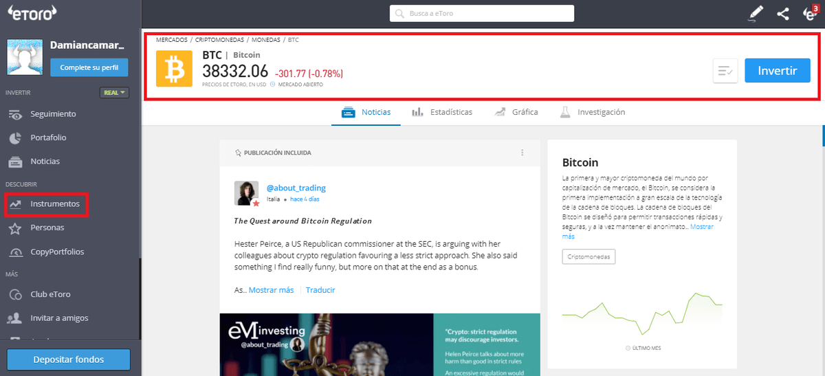 Disponemos de dos opciones para buscar un activo dentro de la plataforma principal de eToro. La primera es hacerlo a través del buscador principal del bróker. Esto es, sencillamente escribir el nombre del activo y dirigirse a su portada. La segunda consiste en ir a la pestaña de “instrumentos”, que se ubica en el menú principal. Allí encontraremos toda la selección de mercados que están disponibles en eToro: