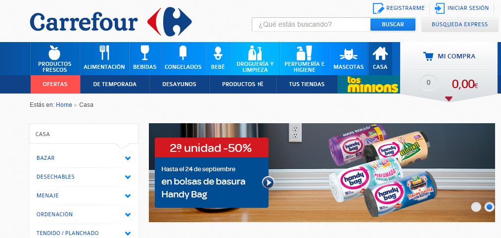 - Compra online y a casa: lo primero que debemos mencionar es que en Carrefour también puedes hacer todas tus compras de manera online si no tienes tiempo de ir a la tienda. Verás que tienen un catálogo de lo más extenso y es que es de lo más fácil encontrar todos los productos que estás buscando. Además, se aplican las mismas ventajas de financiación si pagas con tu VISA PASS.
