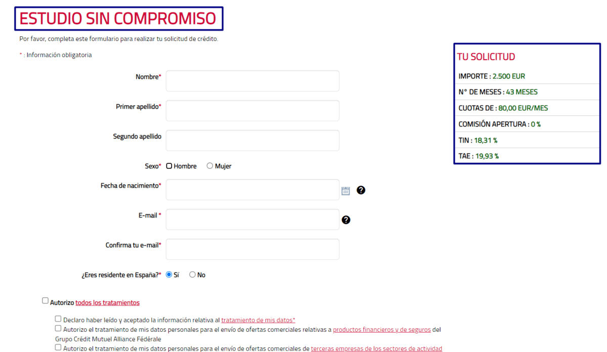 En esta entidad financiera que se dedica a los créditos, y que ofrecen préstamos rápidos y fáciles desde su web. La cantidad puede ir desde los 500 a los 4.000 euros y puede elegir devolverlos entre 13 meses y 44 meses.