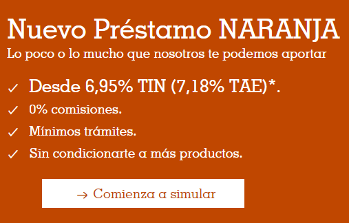Con este préstamo puedes obtener desde 6.000 hasta 40.000 euros sin necesidad de domiciliar la nómina. Solo está disponible para clientes que hayan demostrado un correcto comportamiento en los pagos. Tiene un interés fijo del 6,95% y el plazo máximo de devolución son 7 años. No tiene comisiones de apertura ni por amortización anticipada.