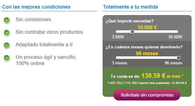 Se puede pedir a través de internet desde 300 euros hasta un máximo de 30.000 euros a un tipo de interés del 9,25% si no se tiene la nómina domiciliada, con una comisión de apertura del 1,5% y de cancelación anticipada del 1%. Un crédito que se puede pagar en un periodo que va desde los 3 meses hasta los 6 años y que tiene aparejado un seguro que cubre contra el desempleo y contra la incapacidad temporal.