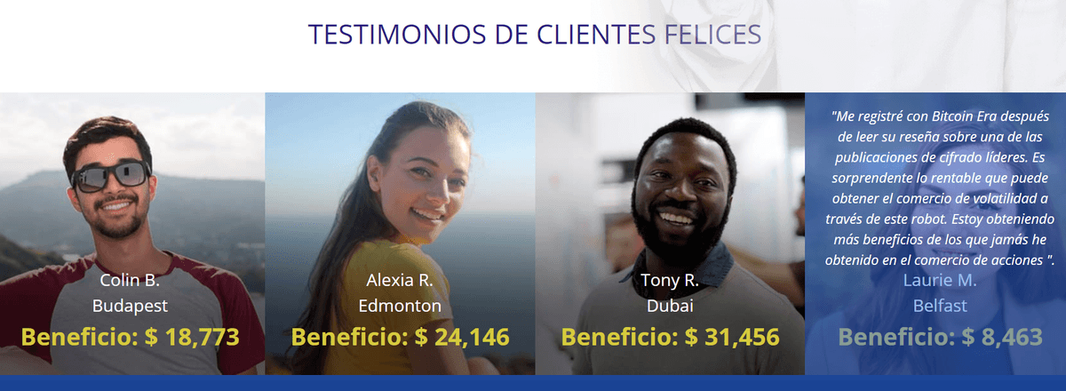 Con Bitcoin Era supuestamente se puede ganar dinero, pero no está claro cuál es el activo a invertir, la cantidad inicial o el tipo de posición o estrategia utilizada. A continuación mencionamos algunos Bitcoin Era testimoniales: