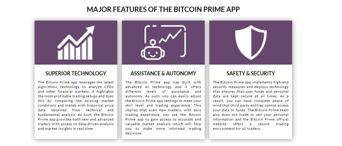 Bitcoin Prime es un robot para hacer trading automático que permite a sus usuarios operar las 24 horas del día. Desde su surgimiento en el año 2015, la plataforma ha sido utilizada por inversores de diversas partes del mundo. Según la propia plataforma, el sistema de comercio automatizado que la respalda supuestamente promete poder generar un beneficio de hasta un 200% en base al depósito inicial mínimo.