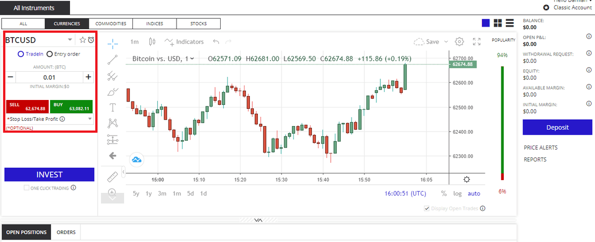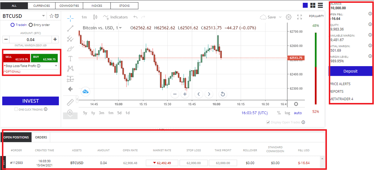 Una vez en la plataforma, lo que nos queda es empezar a probar las funciones y las distintas estrategias. Como vemos, podemos invertir en Bitcoin, por ejemplo, con Stop Loss y Take Profit.