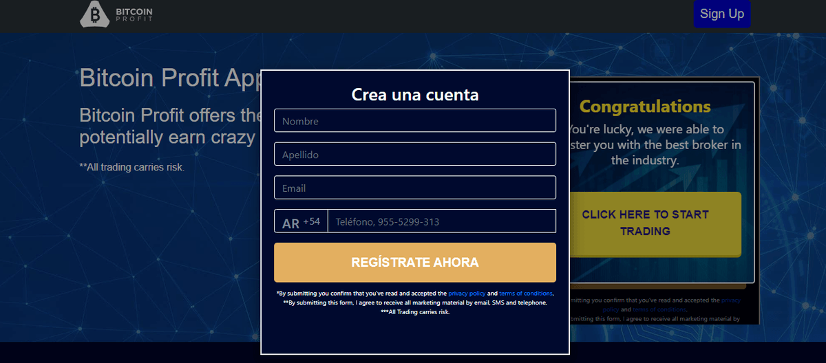 Abrir una cuenta en Bitctoin Profit es sencillo y el proceso no dura más que algunos minutos, muy similar al que mostramos en nuestras opiniones sobre Bitcoin Evolution. Lo primero que hacemos es dirigirnos a la página principal e ir a «Sign Up«. Allí se nos desplegará el siguiente formulario.