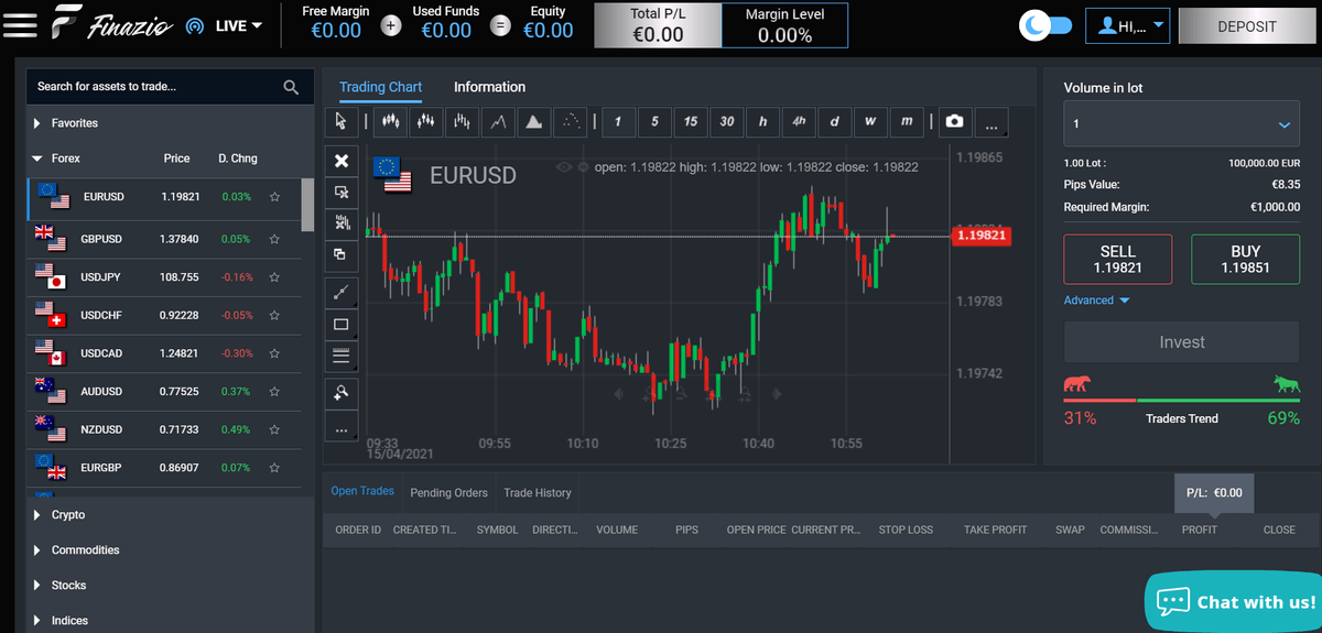 El bróker Finazio, asociado a Bitcoin Up, opera a través de los CFDs, no permitiendo inversión al contado. Se puede seleccionar un apalancamiento hasta 1:500 y la posibilidad de situar márgenes Take Profit y Stop Loss para marcar los parámetros. También se pueden automatizar las posiciones.