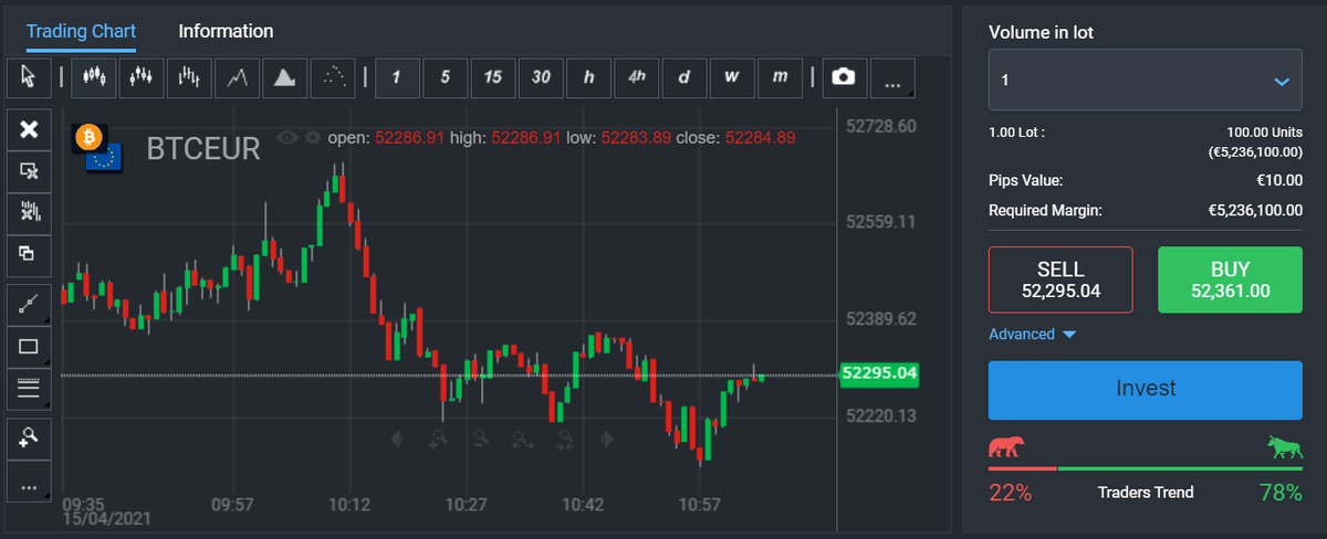 Al seleccionar un instrumento, como el BTC/EUR de la imagen, puedes ajustar la visión gráfica y los indicadores que se muestran, así como las actualizaciones a tiempo real del precio del activo.
