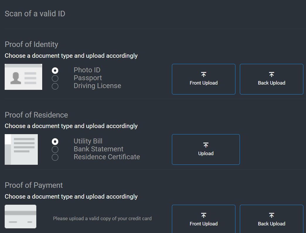 Para verificar tu cuenta, puedes subir tus documentos desde el menú de la gestión de cuenta: necesitarás un documento de identidad y un documento de recibo que vincule tu domicilio. Puedes hacerlo en cualquier momento, pero recomendamos hacerlo antes de iniciar el trading.