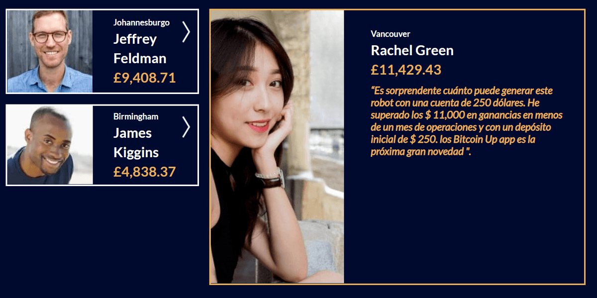 Del mismo modo, en la página web de Bitcoin Up podemos encontrar testimonios reales de clientes destacados que han compartido su experiencia con este robot. De entrada, por supuesto, son todos positivos. No podemos asumir que toda experiencia haya sido igual a éstas en base a la información contenida o a la supuesta promesa de ganancias. Del mismo modo no pueden tomarse como ciertas cualesquiera Bitcoin Up opiniones que encontramos en la red, pues hay sitios fraudulentos o que difunden información no veraz.