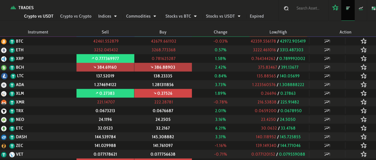 Para buscar cualquier activo dentro del bróker debes dirigirte al buscador, situado en la parte izquierda de la interfaz. En el caso de nuestro bróker nos permite operar con diversos activos, desde criptomonedas hasta acciones o Forex.