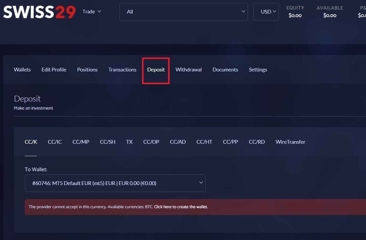 Como puedes comprobar, en nuestro caso, el bróker nos permite varios métodos de pago, entre ellos destacamos la posibilidad de realizar un depósito en Bitcoin a través de nuestra wallet.